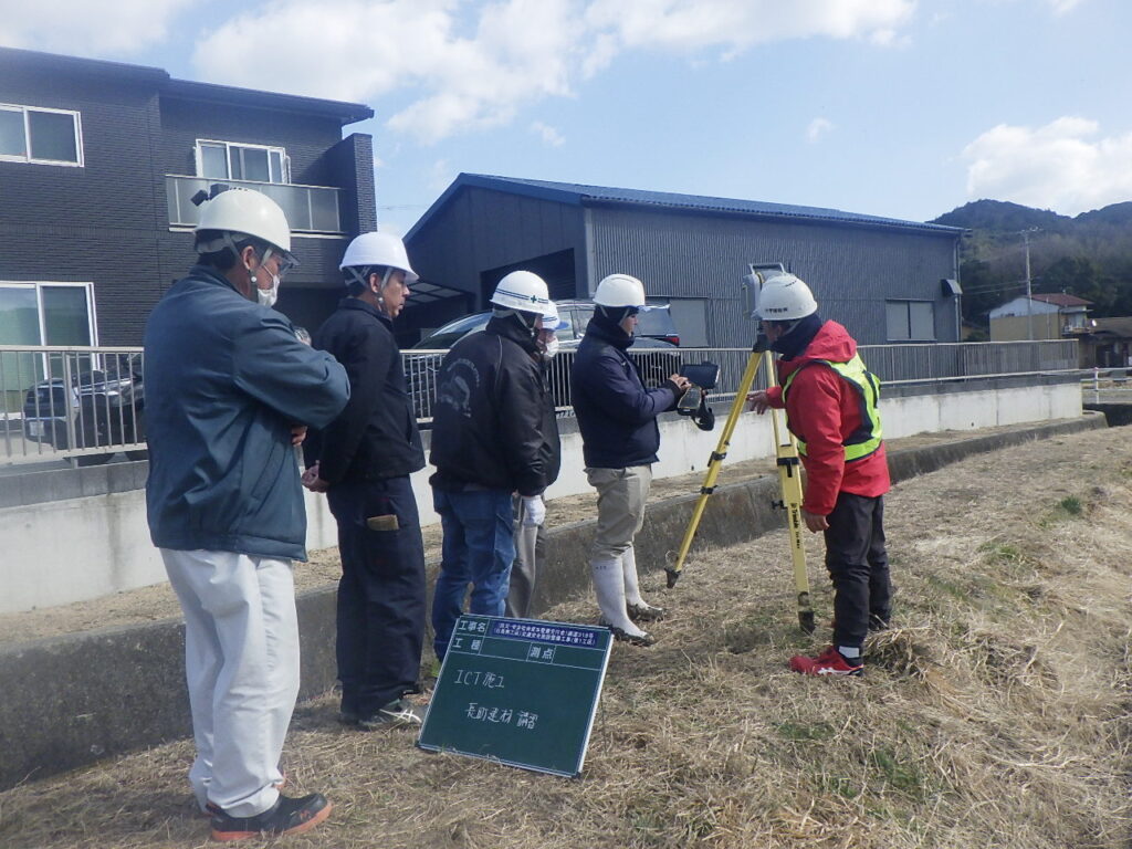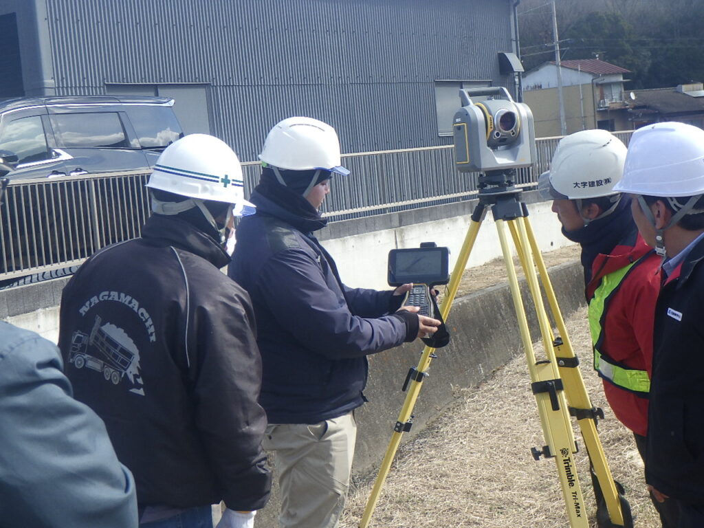 令和7年9月2日には、本工事現場にてICT活用工事の見学会を開催し、東かがわ市内の(株)長町建材様の社員8名に参加していただきました。内容としては、① ICT施工技術を活用するまでの課題 ② 現在所有の自動追尾型トータルステーション(FOCUS50)の活用経験 ③ ICT活用工事を経験しての効果 ④ 次段階への課題 を中心に行いました。